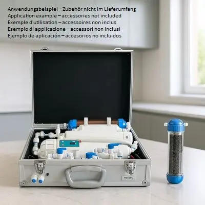 Die Kartusche entfernt effektiv Härtebildner und Kieselsäure (SiO₂) und ermöglicht dadurch eine extrem niedrige Leitfähigkeit sowie eine minimale Gesamthärte. Zudem wird ein Absinken des pH-Wertes in den sauren Bereich zuverlässig vermieden – für dauerhaft stabiles Wasser.